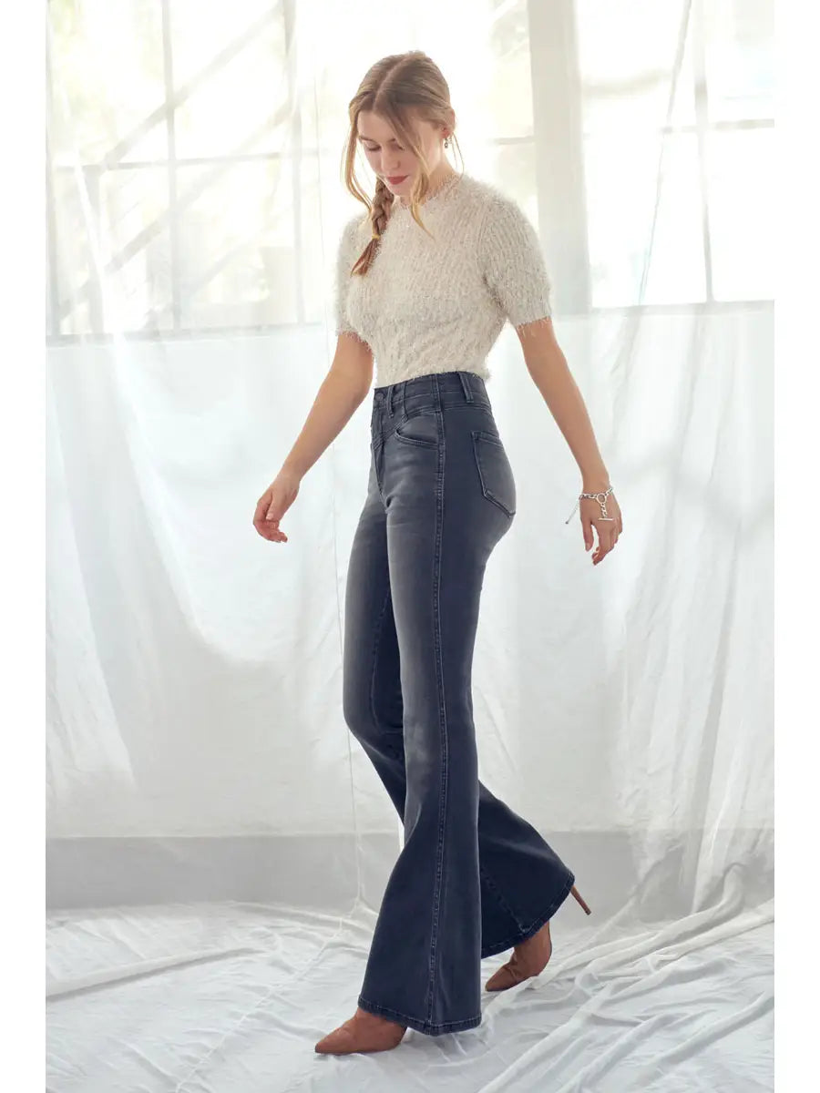 Elongate your legs with this pair of high-rise extreme flare jeans! Featuring whiskering, fading, single-button front closure, and a 4-pocket design.Single-button front closure, Zip fly, 4-pocket design11" Rise / 33.5" Inseam (Size 5)67% Cotton, 31% Polyester, 2% SpandexModel in size 3/25Style # : KC7150BKStretchiness Level >> StretchSIZE WAIST HIP1/24Â Waist 23.5" Hip 30.5"3/25 Waist 24.5" Hip 31.5"5/26 Waist 25.5" Hip 32.5"7/27 Waist 26.5" Hip 33.5"9/28 Waist 28" Hip 35"11/29 Waist 29.5" Hip 36.5"13/30 Waist 31" Hip 38"15/31 Waist 32.5" Hip 39.5"